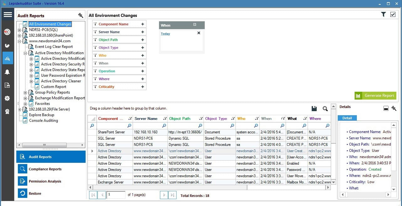 LepideAuditor suite is a comprehensive, compatible and cost effective solution for your prime auditing needs. It features an exclusive automated tool that can trackany changes accurately and effectively at the time the change is happening. It can monitor changes across Active directory, Group Policy, Exchange, SQL Server, SharePoint, File Server and Office 365. One can be rest assured of delivery and time management with Lepide's pre-set tools right from report generation to scheduled report delivery. In reality, this is what you would call as 'auditing automated.